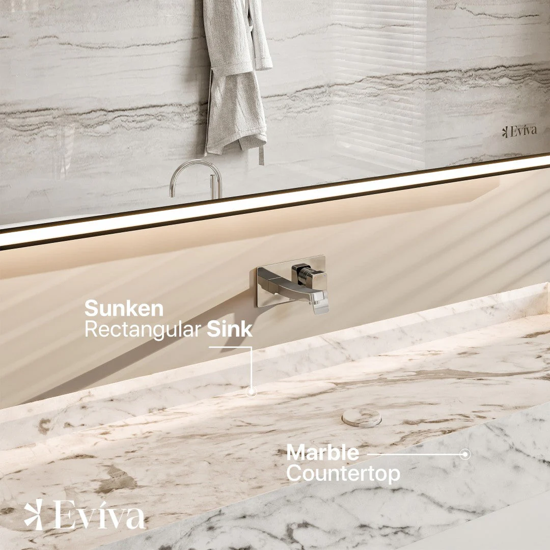 Fritti distills luxury into a sleek, wall-hung silhouette—marble cascading over a crisp white cabinet for effortless glamour. The 4-inch-thick Carrara top with its sunken trough basin feels architectural and serene. Pair with a streamlined wall-mount faucet and warm backlit mirror to heighten the spa-like ambiance. It’s a refined essential that anchors a bath in modern, livable luxury.
