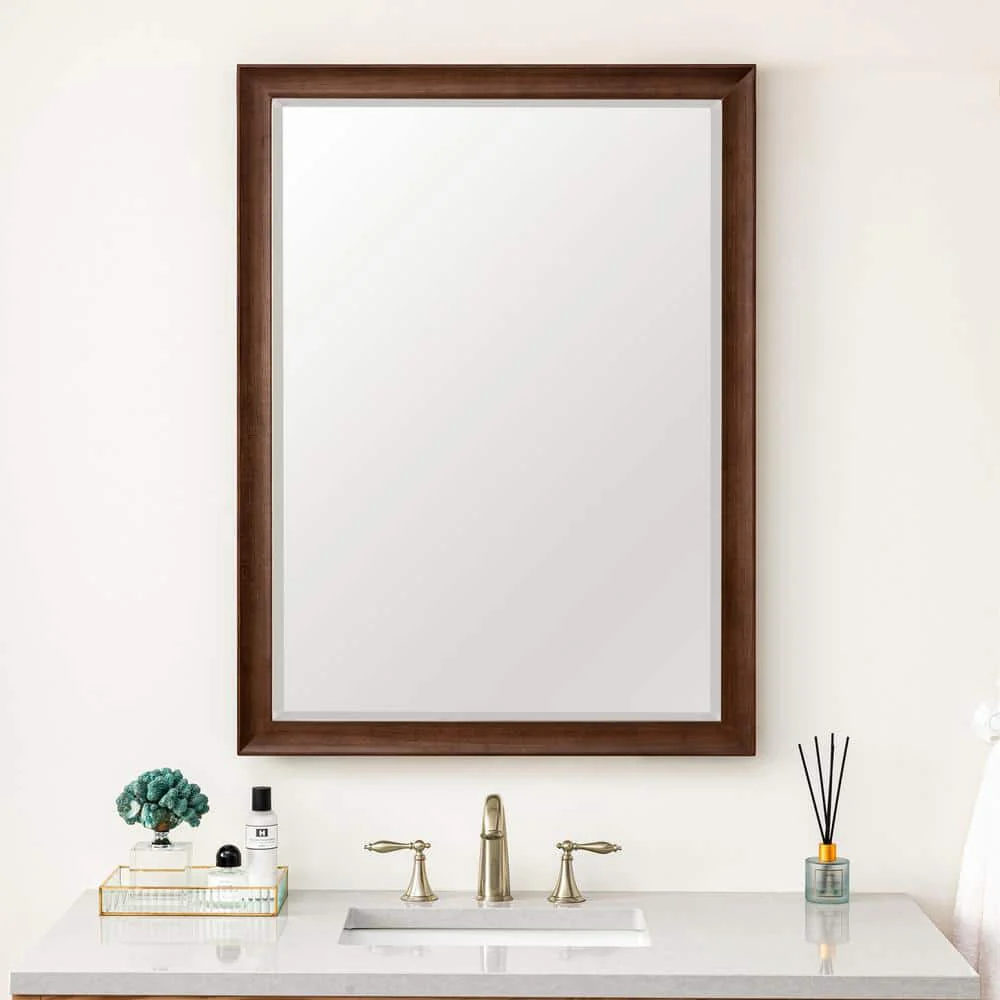 The Glenbrooke Vanity Mirror by James Martin Vanities features a mid-century walnut finish and a timeless rectangular design. Crafted with premium materials, it includes a 1-inch beveled glass and versatile mounting options.